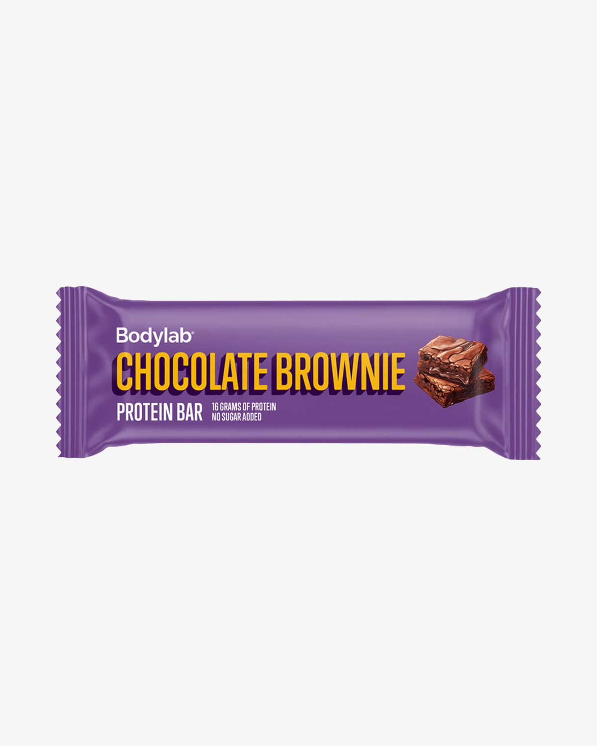 Proteinbar med smak av brownie og sjokolade. Inneholder søtningsmidler.