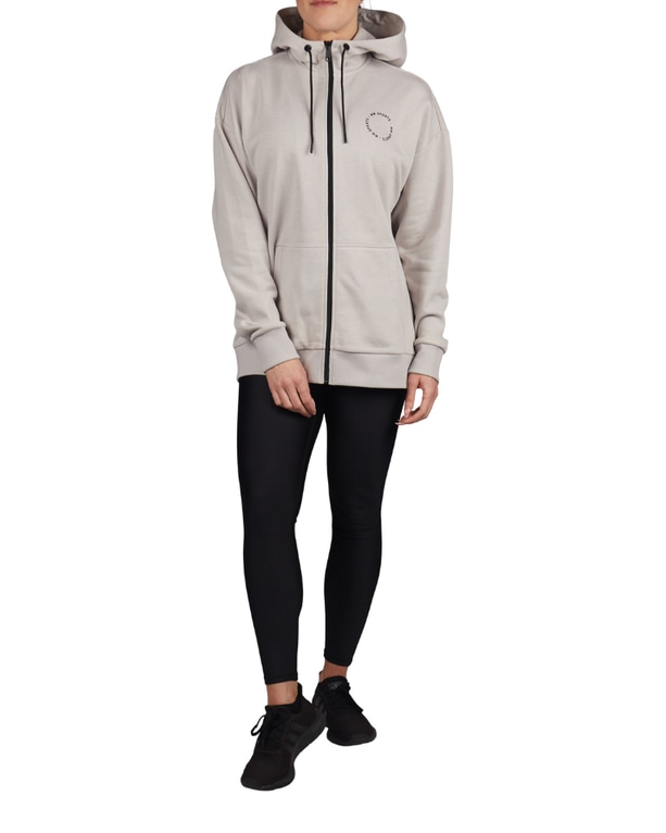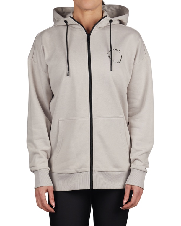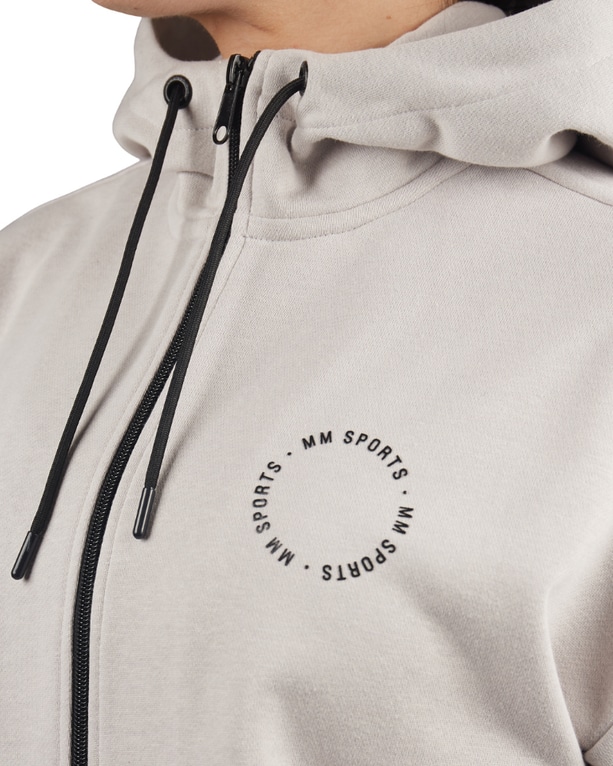Hoodie til dame, i lengre modell med glidelås og en komfortabel, høy krage. Den er laget av en tynnere bomullsblanding som gjør den komfortabel å ha på seg. Fôret hette med snøring, og lomme foran. Fine detaljer, og MM Sports-logo foran på brystet.