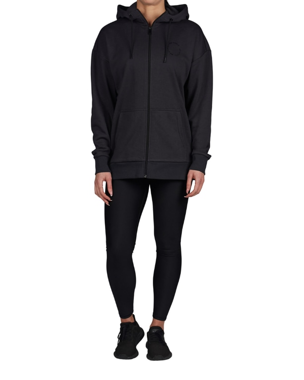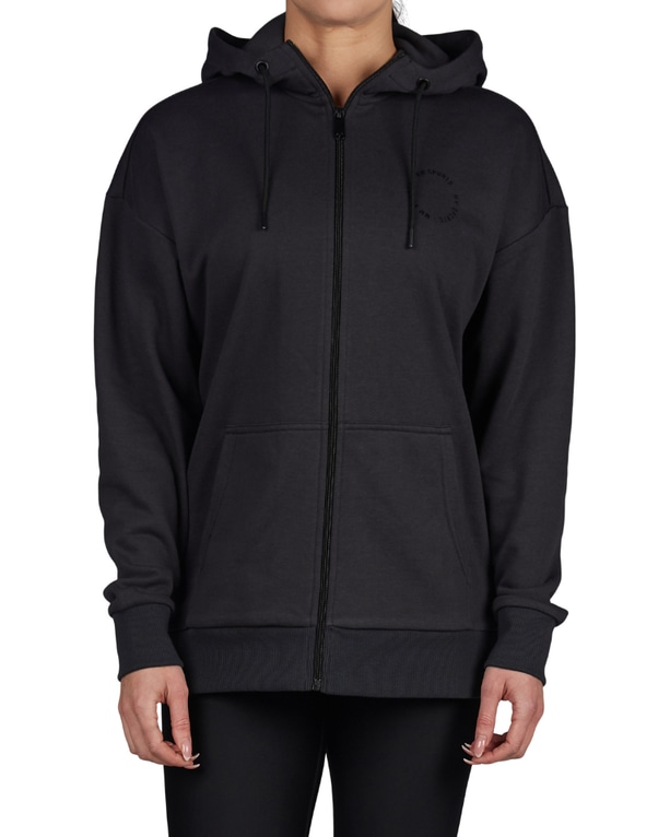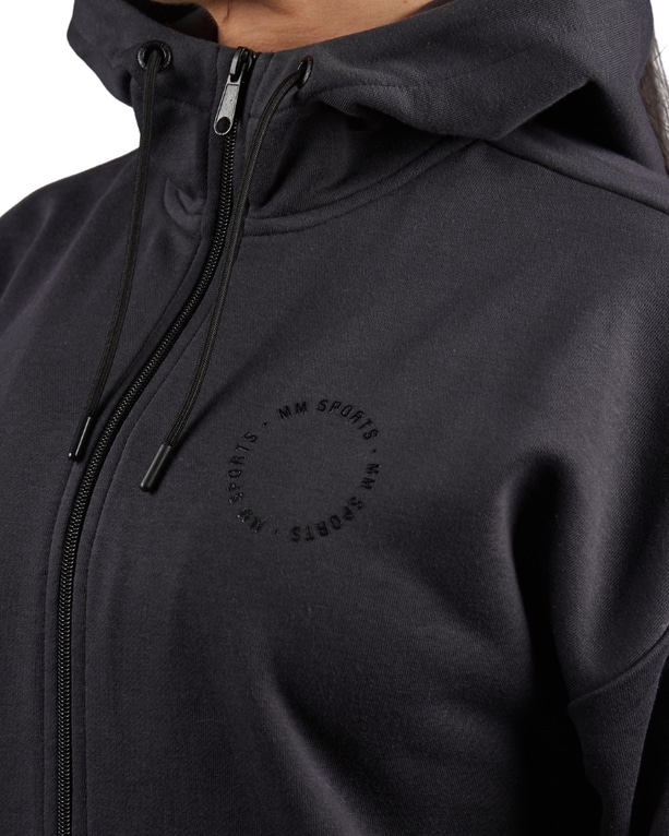 Hoodie til dame, i lengre modell med glidelås og en komfortabel, høy krage. Den er laget av en tynnere bomullsblanding som gjør den komfortabel å ha på seg. Fôret hette med snøring, og lomme foran. Fine detaljer, og MM Sports-logo foran på brystet.