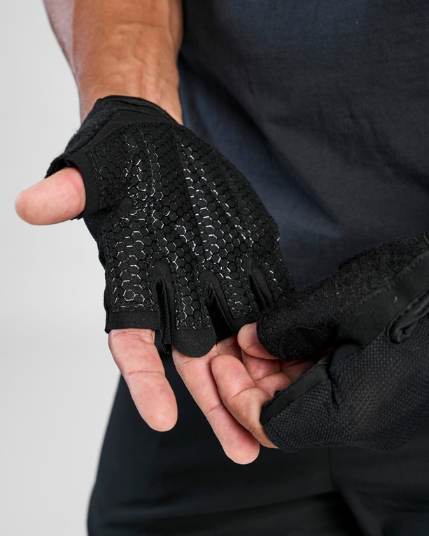 Innvendig er hansken polstret med silikonmønster for bedre grep og redusert risiko for glidning – spesielt viktig ved tunge løft. Takket være fliker på langefinger og ringfinger er de enkle å ta av etter bruk.